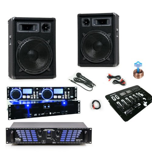 Beschreibung:Mit dieser 1200 Watt DJ-Komplettanlage haben Sie das Zeug zum professionellen DJ. Zwei 3-Wege Boxen mit jeweils 600 Watt, ein Verstärker Nightline Pro 600, ein Doppel-CD/MP3-Player SD USB Slot Hollywood My-Mix und ein Mischpult MX-5B sind die Bestandteile dieses fantastischen Sets.Die robusten Full-Range Boxen sorgen mit einer Gesamtleistung von 1200 Watt für ein tolles Klangerlebnis. Das mit Filz bezogene Gehäuse verträgt problemlos auch gröbere Stöße - also auch ideal für mobile DJs und Partykeller!Druckvolle Höhen, weiche Mitten und kraftvolle Bässe garantieren auch bei hoher Belastung einen satten Sound, ob für Disco- oder Rockmusik.Das Profi DJ Mischpult 'MX-5B' im robusten Metallgehäuse verfügt neben 2 VU-Levelmeter (L/R) über 5 Kanäle mit separater Klangregelung und einem Crossfader, welcher beim Mixen von einem zum nächsten Song perfekte Übergänge ermöglicht. Sobald das DJ-Mikrofon besprochen wird, wird das Ausgangssignals um 14dB automatisch abg...