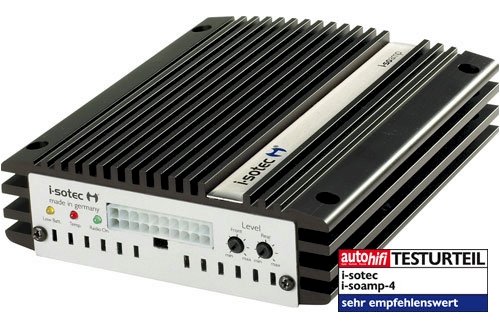 4-Kanal Verstärker, 4x65Watt Ausgangsleistung Der i-soamp-4 ist ein 4-Kanal Car-Audio-Verstärker, der speziell für den Einsatz in Fahrzeugen mit fest eingebautem (OEM) Autoradio konzipiert wurde. Eine komplette Adapterlinie ermöglicht den Anschluss ohne aufwendige Verkablungsarbeiten bei mehr als 500 Fahrzeugvarianten. Natürlich kann der i-soamp-4 auch mit jedem handelsüblichen Autoradio betrieben werden. Es besteht außerdem die Möglichkeit, 2 der 4 Kanäle in Brücke zu schalten, um so nahezu der doppelten Leistung Subwoofer betreiben zu können. Die vielfältigen Einstell- und Anpassungsmöglichkeiten machen den i-sotec i-soamp-4 zum Allround-Genie im Auto. Kabel zum Anschluss an Autoradios mit ISO-Ausgang (siehe Abbildung) im Lieferumfang enthalten. Einbautipp: Der i-soamp passt problemlos unter den Sitz oder in den Fußraum. Ein 2 Meter Anschlusskabel ist serienmäßig dabei. Mehr Kabel müssen nicht verlegt werden. Technische Daten i-soamp-4 Betriebsspannung 11,3-14...
